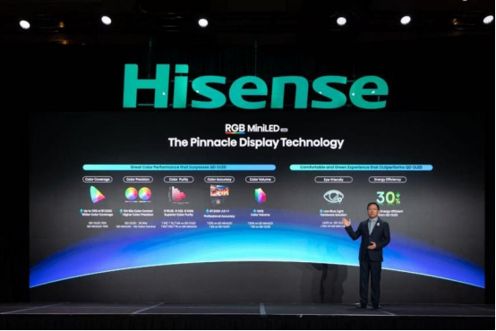 海信全新一代RGB MiniLED通过全自研海信玲珑真彩背光+全自研信芯AI画质芯片的关键创新技术突破,具备超高色域、超高色准、(稳定)超高亮色、超低蓝光、超低功耗等优势,已经超越包括QD-OLED和QD-Mini LED在内的量子点产品,技术能力领先韩日一代,重新定义了高端电视好画质标准。